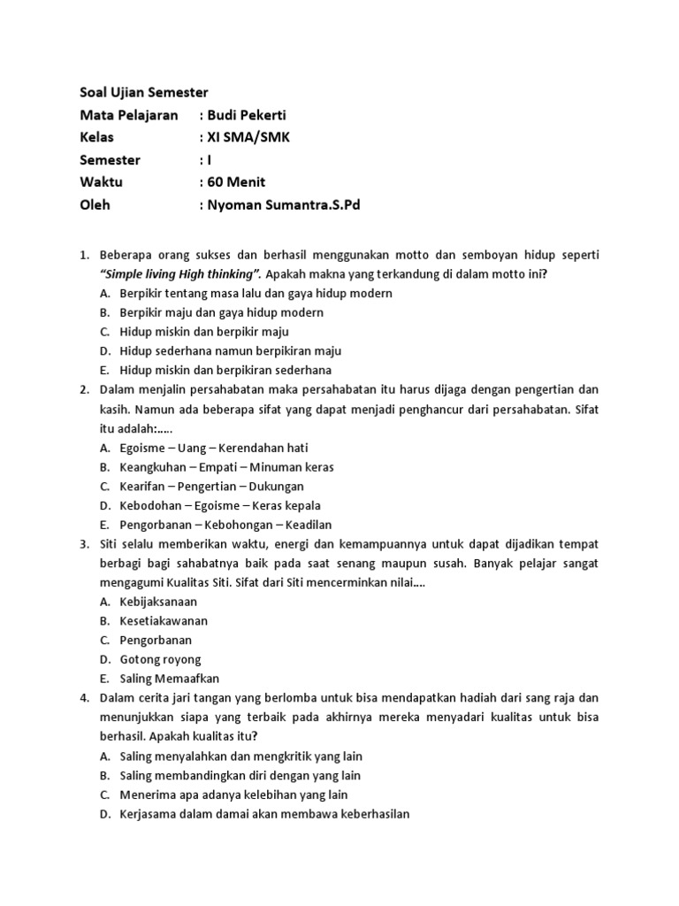 Soal Ujian Budi Pekerti Smk Sma Kls Xi