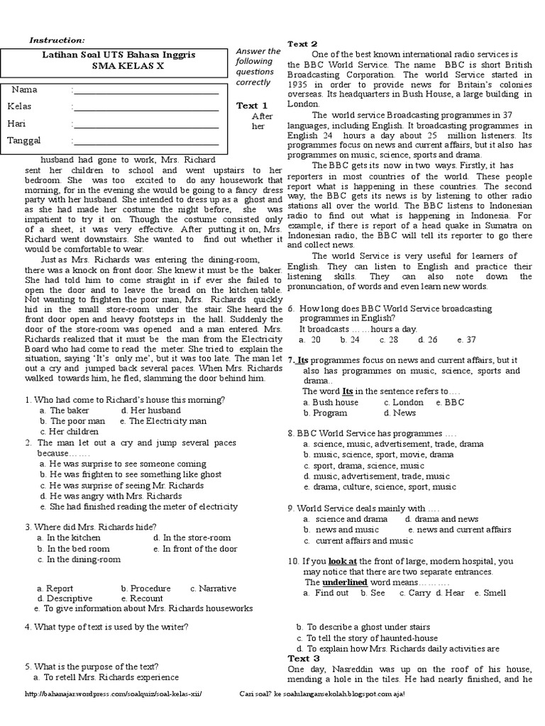 Soal Latihan Uts Sma Kelas X Bahasa Inggris Indonesian Language Bbc