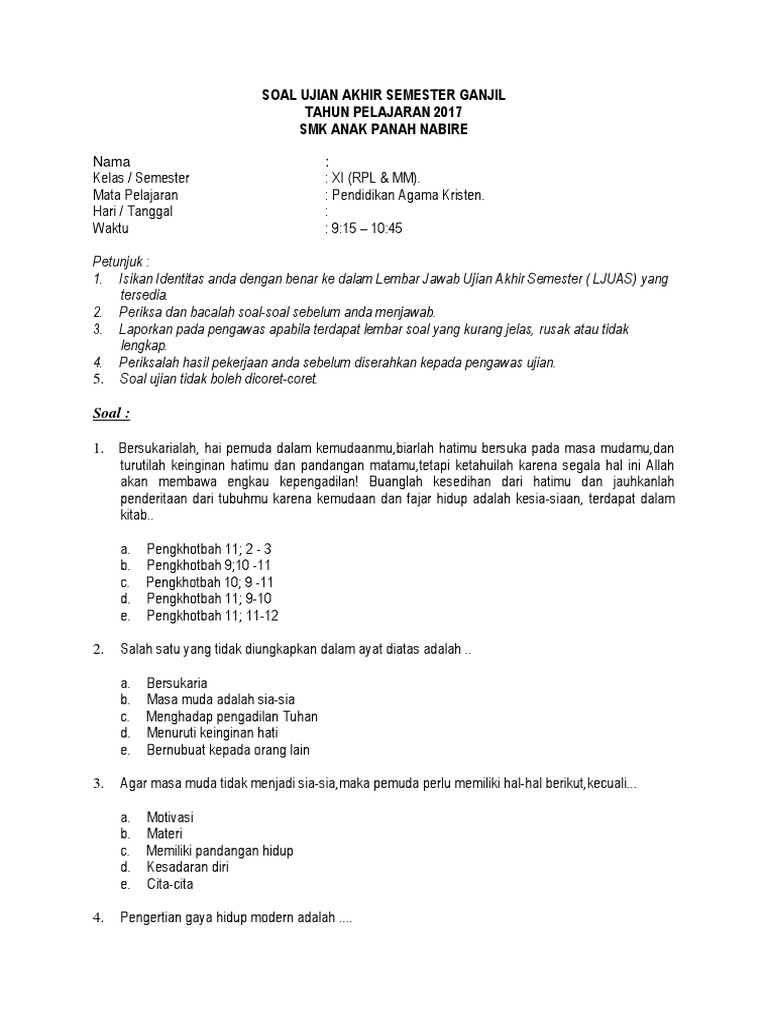 Latihan Soal Uas Agama Kristen Kelas 11 Semester 1 K13 2021 Dan Kunci Jawaban