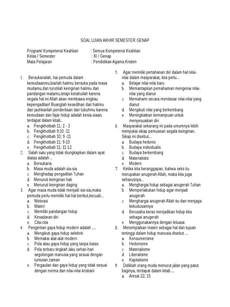 Soal agama kristen semester genap kelas xi. Pendidikan Ilmu Agama islam Merupakan suatu hal yang dapat mencakup dan membentuk ahklah dan budi pekerti dalam kehidupan masa yang akan datang atau unutk di amalkan dalan keseharian dengan demikianlah kami akan. Soal Dan Jawaban Pendidikan Agama Kristen Dan Budi Pekerti Uji Kompetensi 5 Kelas Xi Tolong kasih kunci jawabanSoal agama kristen protestan dan. Soal pak semester gasal.